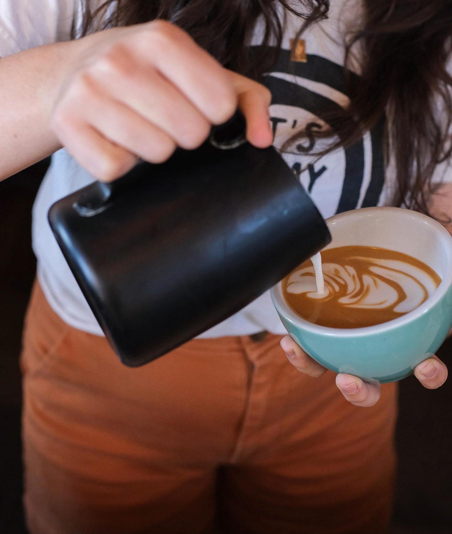 Now Serving: Americano, Espresso, Cappuccino, and Lattes.
